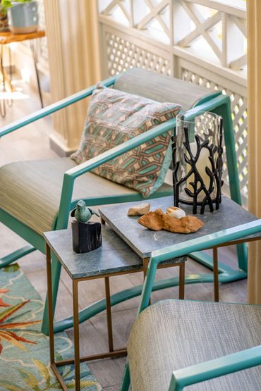 Enjoy an expansive outdoor veranda that spans the length of the condo, featuring a dining area for six and a cozy living space set among lush palm trees. Inside, the fully remodeled interior offers a gourmet kitchen with a five-burner gas stove and handcrafted furniture that creates a sanctuary-like ambiance.